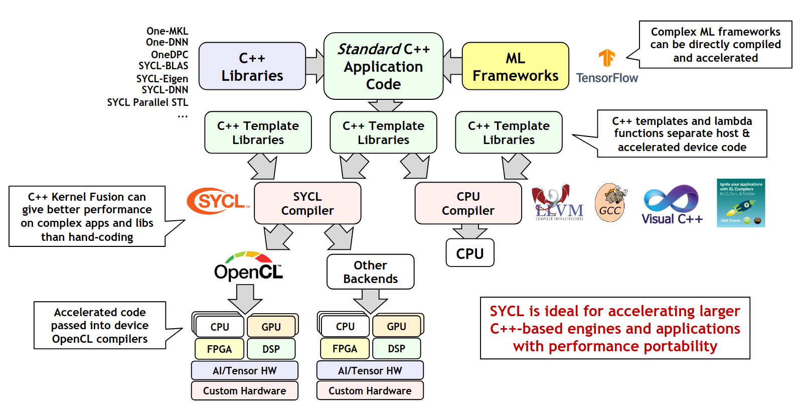 SYCL (Specification for Unified Cross-platform C++) provides a higher-level model for writing standard ISO C++ code that is both performance-oriented and portable across various hardware, including CPUs, GPUs and FPGAs It enables the use of standard C++ with extensions to leverage parallel hardware. Host and kernel code share the same source file. The DPC++ compiler is adding SYCL support on top of the LLVM C++ compiler. DPC++ is distributed with the Intel® oneAPI toolkit.