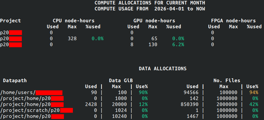 One of the important commands you need to know on MeluXina is myquota. It shows the compute and data allocations for each of your projects.