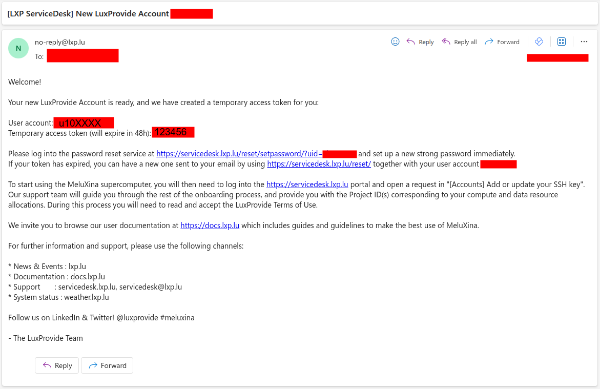 If this is the first time that you're accessing MeluXina, you have received an email with your login information. This email with subject "New LuxProvide Account" (example on the right) includes two important pieces of information to set up your account: