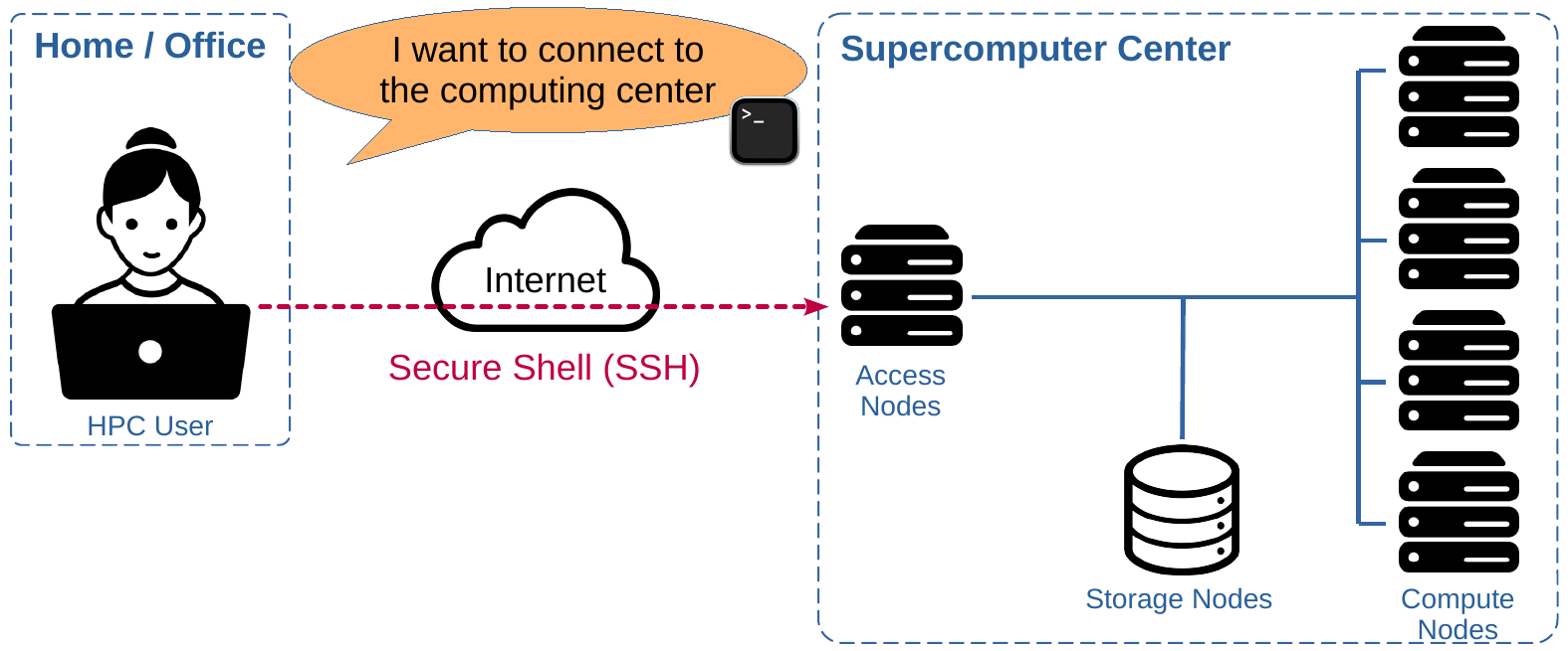 The Command Line Interface (CLI) with Secure Shell (SSH) is the de-facto standard to access remote Linux machines and supercomputing platforms. It is fast, lightweight, and secure. The security relies on an SSH key pair (public/private keys) which is tied to a specific machine (e.g., your laptop) which can be granted (or not) access to the supercomputer.