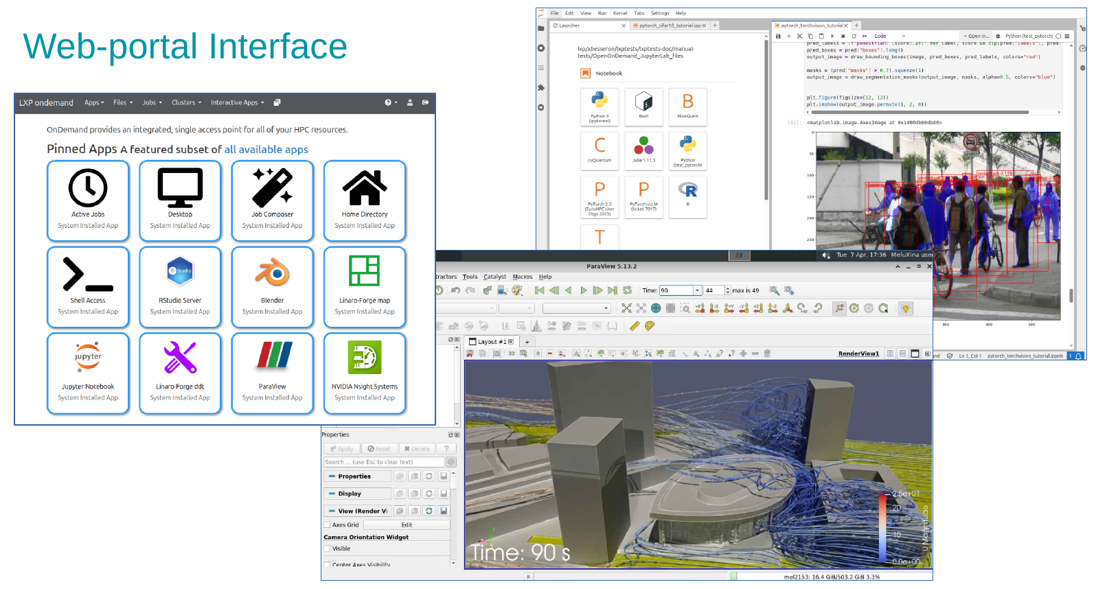 Other applications will be used in the following parts of the training. In the Urban wind simulation and visualization, you will use the ParaView application to visualize the result of your simulation. In the PyTorch notebooks with JupyterLab, you will start a JupyterLab on a compute node to perform a deep learning training and finetuning with PyTorch.