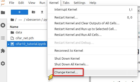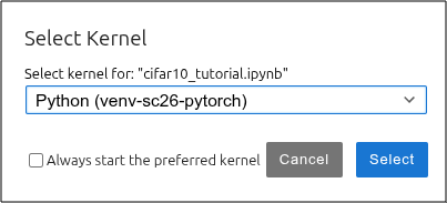 In the top menu Kernel, click on Change Kernel.... Then select the pre-configured PyTorch kernel Python (venv-sc26-pytorch).