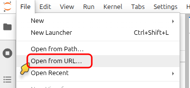 In JupyterLab, go to the menu File and click Open from URL....
